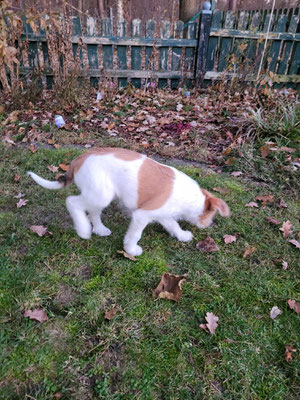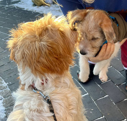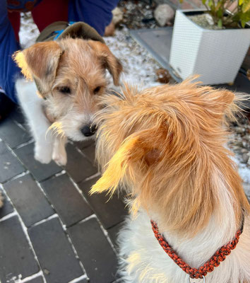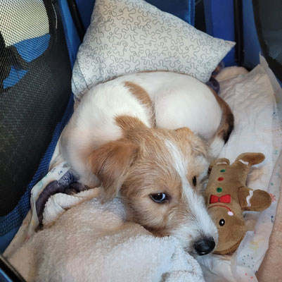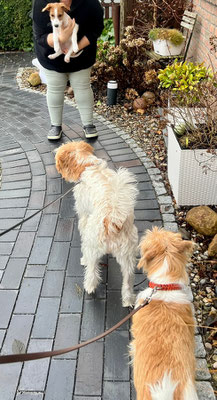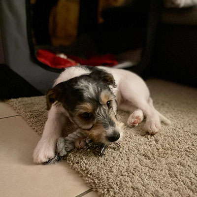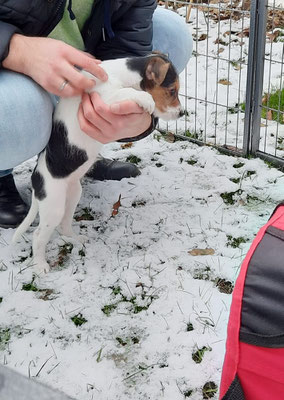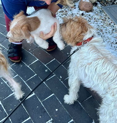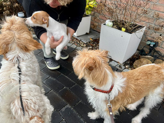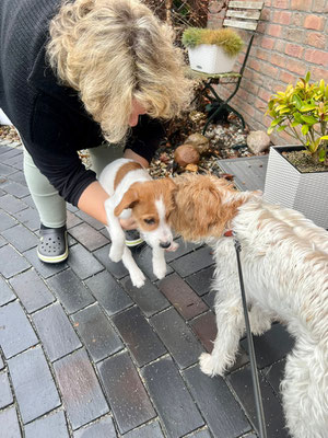Hummel spürt ganz genau, wer von den Welpen als nächstes auszieht. Sie hat sich am Vortag und am Abholtag ganz besonders Bilbo gewidmet, im Spiel und auch mit kleineren „Ansagen“.